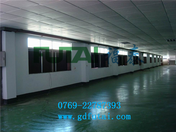 解決方案二:像這類車間用負壓水簾風機降溫效果很好的,可以調節室內干燥導致的線絨到處飛舞,增加室內濕度更有利于車間環境的改善,另一面墻上安裝的水簾有很多小孔,室外空氣在大氣壓下自動流入室內。因此空氣不斷與室外循環。如果安裝的合適,室內的所有空氣都會參與這個大循環。因此對于污濁、煙霧、灰塵、異味的房間而言,這種通風模式最徹底。考慮到投入成本,有些客戶會僅僅選擇負壓風機,而不安裝降溫水簾。此時風機對面的空氣經過門和窗戶進入,沒有降溫處理。室內空氣流動也會有較好的降溫效果。