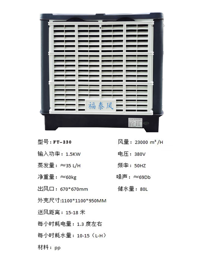 福泰環(huán)保空調性能穩(wěn)定在越炎熱的天氣下降溫的效果越好。適用于開敞式及半開敞式環(huán)境,能夠直接輸送自然風及輸送降溫后的涼風。室外新鮮空氣經福泰蒸發(fā)式冷氣機過濾、降溫后向室內源源不斷的大量輸送,將室內帶有異味、粉塵和混濁悶熱的空氣排出室外,同時兼顧換氣降溫及增加空氣含氧量等多種效果。